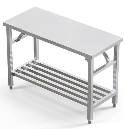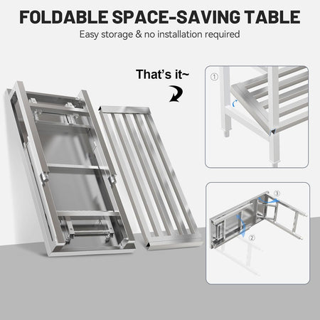 【Extra large storage space】This stainless steel table has a tabletop size: 44 x 20 inch Height: 31.5 inch.When you need an emergency folding work table, you can easily unfold it and finish your work.And it also comes with a lower removable shelf, making it easy for you to get more storage space.