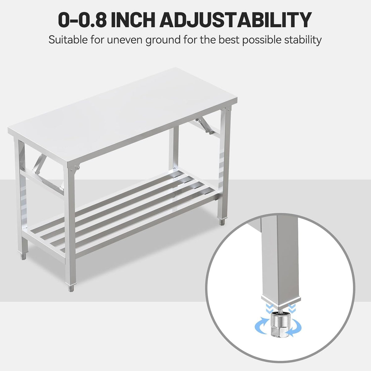 Kitchen Work Table 20'' X 44'' Scratch Resistant and Antirust Folding Stainless Steel Table with Adjustable Table Corners and Lower Removable Shelf for Outdoor Camping, Maintenance Room, Storage