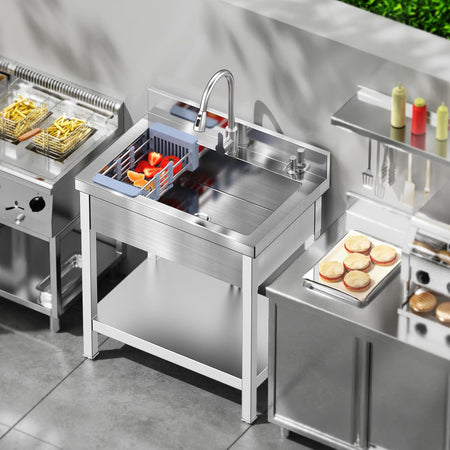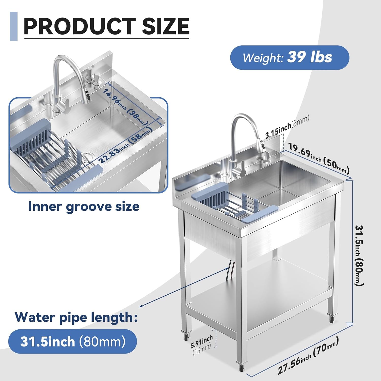 【Multifunctional Pull-Out Faucet】Enhance your cleaning experience with the versatile pull-out faucet included with the utility sink.Extendable up to 17 inches, the faucet features both cold and hot hoses, allowing for versatile use. The size of this kitchen sink is 27.6*19.7*31.5inch,weight 39 lbs. The package comes with sink bowl *1, SUS faucet *1, hot and cold water hoses *2, support legs *4, bullet feet *4, strainer with lid *1, drain set *1,Cleaning the press pot*1,Fruit Filter Basket*1,Full Lower Base Plate.