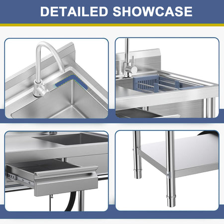 Stainless Steel Utility Sink Commercial Kitchen Sink 40'' Free Standing Tool Sink with Drawer & Cold and Hot Water Pipe for Laundry Room Indoor and Outdoor