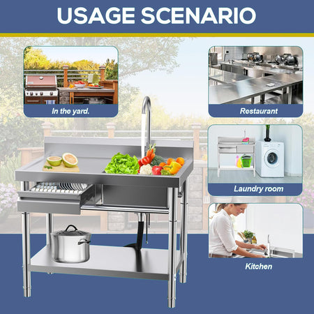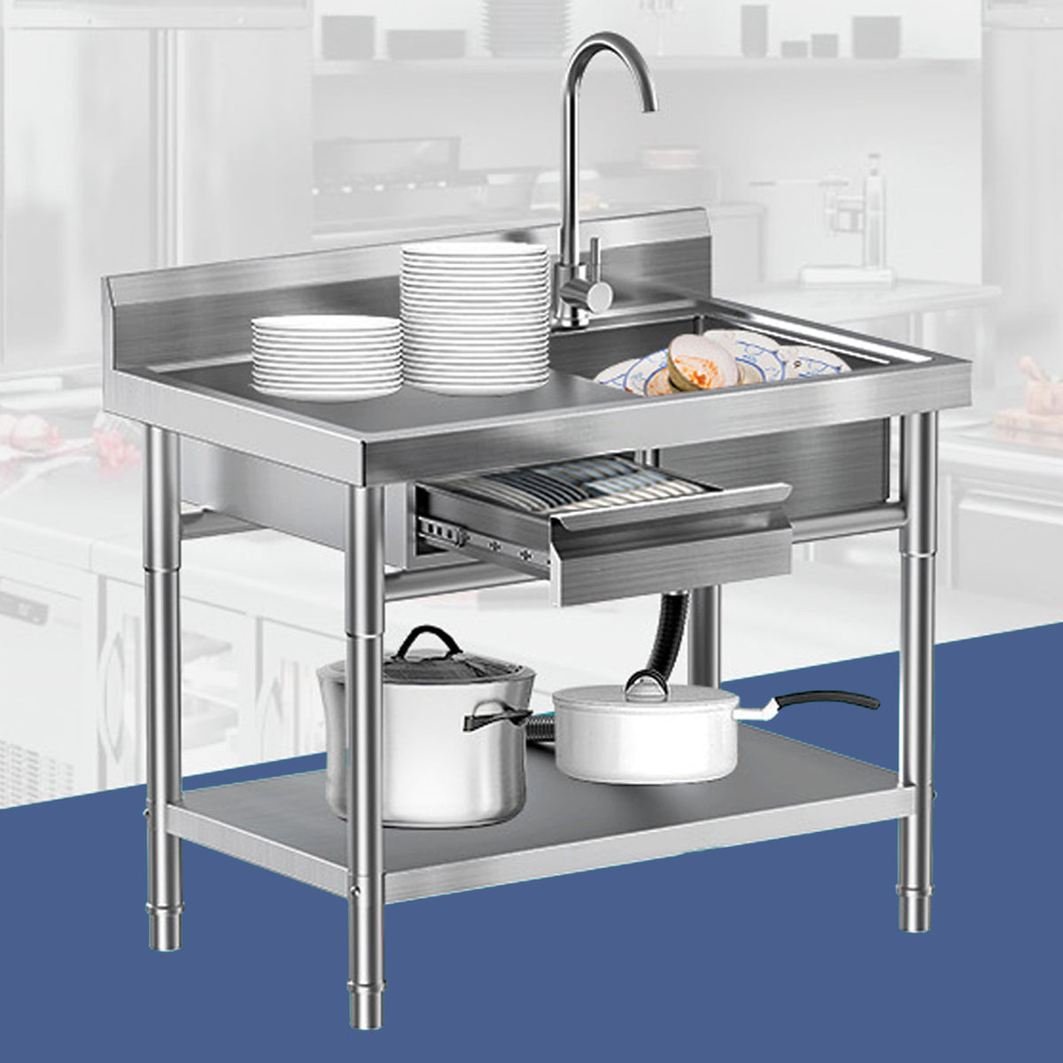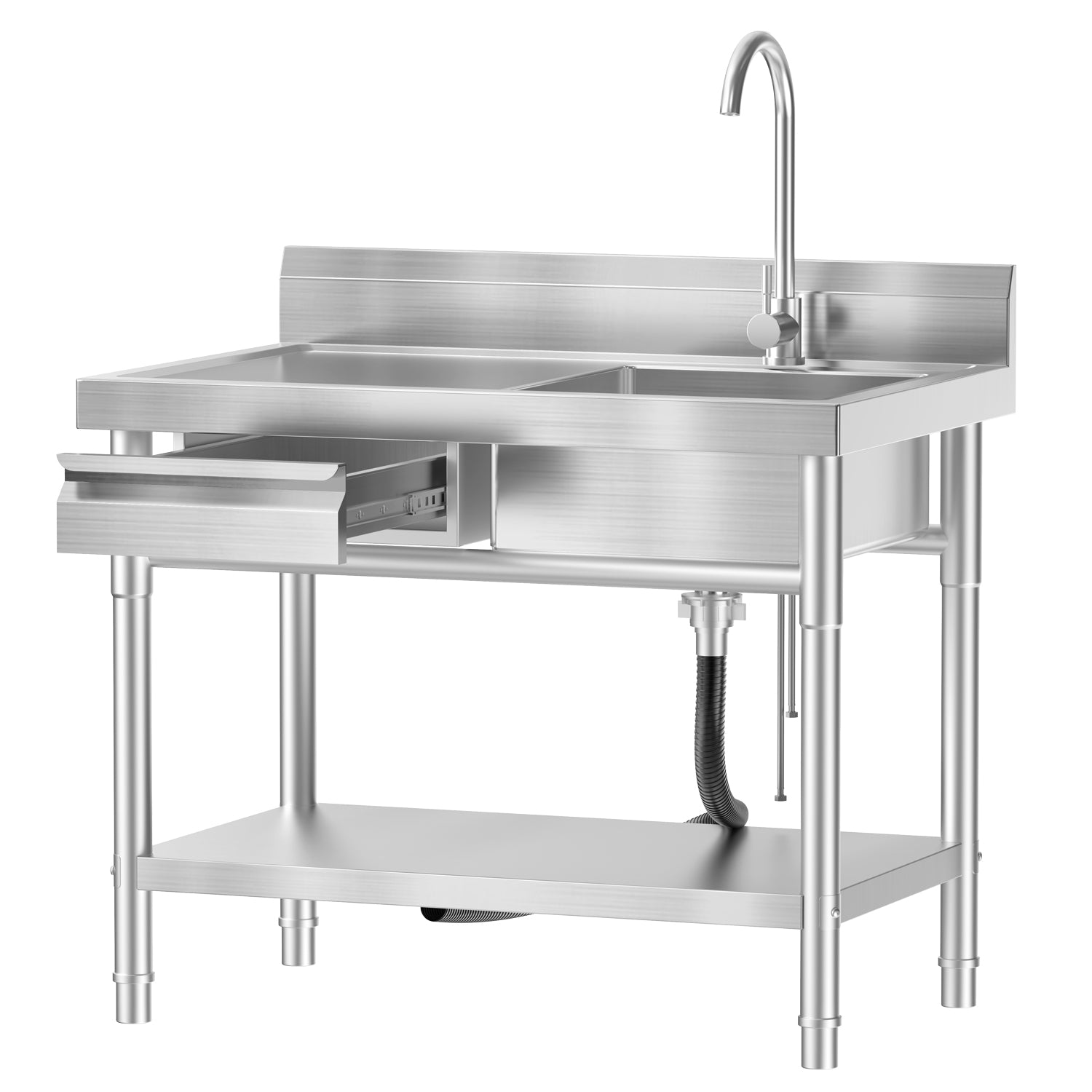 - MULTIFUNCTIONAL FREESTANDING UTILITY SINK: Upgrade your workspace with the Stainless Steel Multifunctional Sink (Overall Dimensions: 40 “W x 32 ”H x 24 "D), which features a spacious workbench, deep countertop sink (Inner Bowl Dimensions: 16x16x8 inches), smooth-gliding storage drawer, and adjustable undermount shelf. This freestanding commercial sink is perfect for laundry rooms, farmhouses, garages, outdoor grills and professional kitchens.
