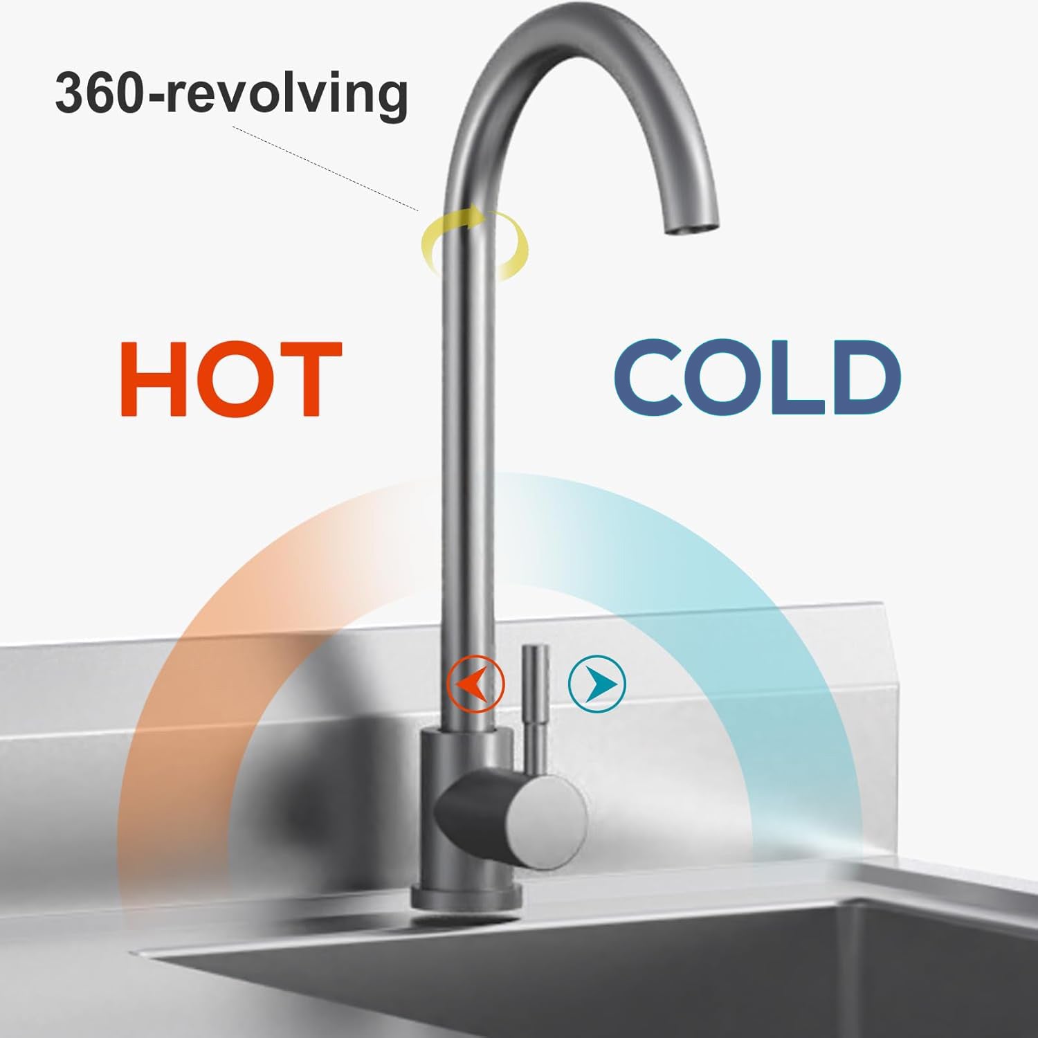 - EFFICIENT DRAIN SYSTEM AND 360° FUTURE: This commercial sink features an efficient drain system with a removable strainer and clog-resistant stainless steel drain spout to prevent clogging. The gooseneck faucet swivels 360° to provide a full range of water flow for easy cleaning. The included hot and cold water hoses allow for quick temperature adjustment to suit a variety of cleaning tasks.